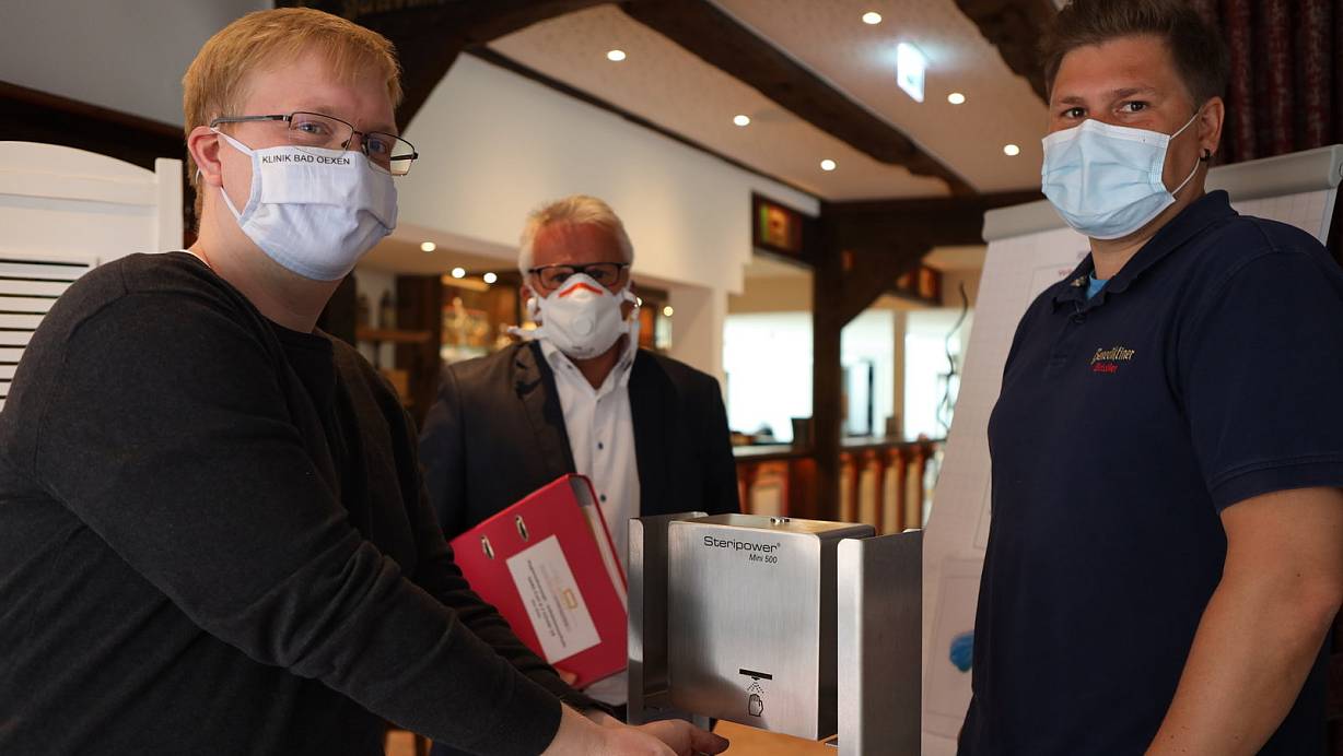 Hygiene-Experte Michael Großkurth (Mitte) mit Geschäftsführer Vitus Schulte (l). und Gastronomieleiter Andreas Bünz an dem Desinfektionsspender im Eingang des Weinhauses Möhle.