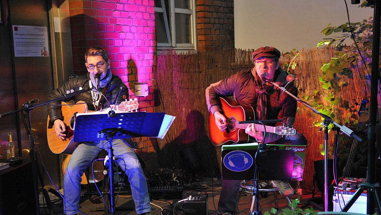 Endlich wieder live: Daniel Farrokh (li.) und Manfred Olke, bekannt als Gitarrenduo Danni & Manni, spielen beim Auftakt der Reihe Zimmerlautstärke im Biergarten der Druckerei. | © Sandra C. Siegemund