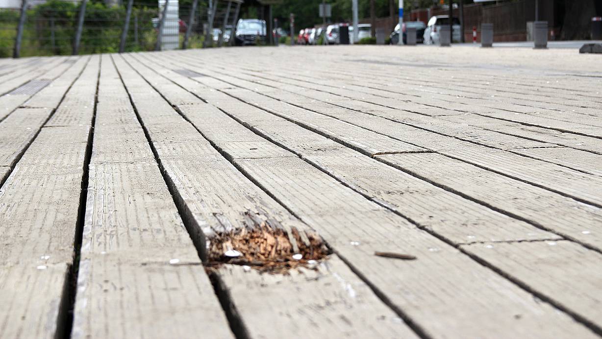In den Bohlen auf den beiden Gehwegseiten der Schützenbrücken tun sich immer wieder Löcher auf. Nun sollen die maroden Holzplanken durch Kunststoffprofile ersetzt werden. | © Heidi Froreich