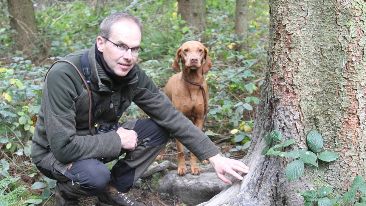 Walter Jäcker (hier mit seinem Jagdhund) ist Vorsitzender der Kreisjägerschaft und Mitglied der AG Natur und Umwelt. Er nimmt aus Sicht der Jägerschaft und von Naturschützern Stellung zum Mountainbiken im Wiehengebirge. | © Teresa Kröger