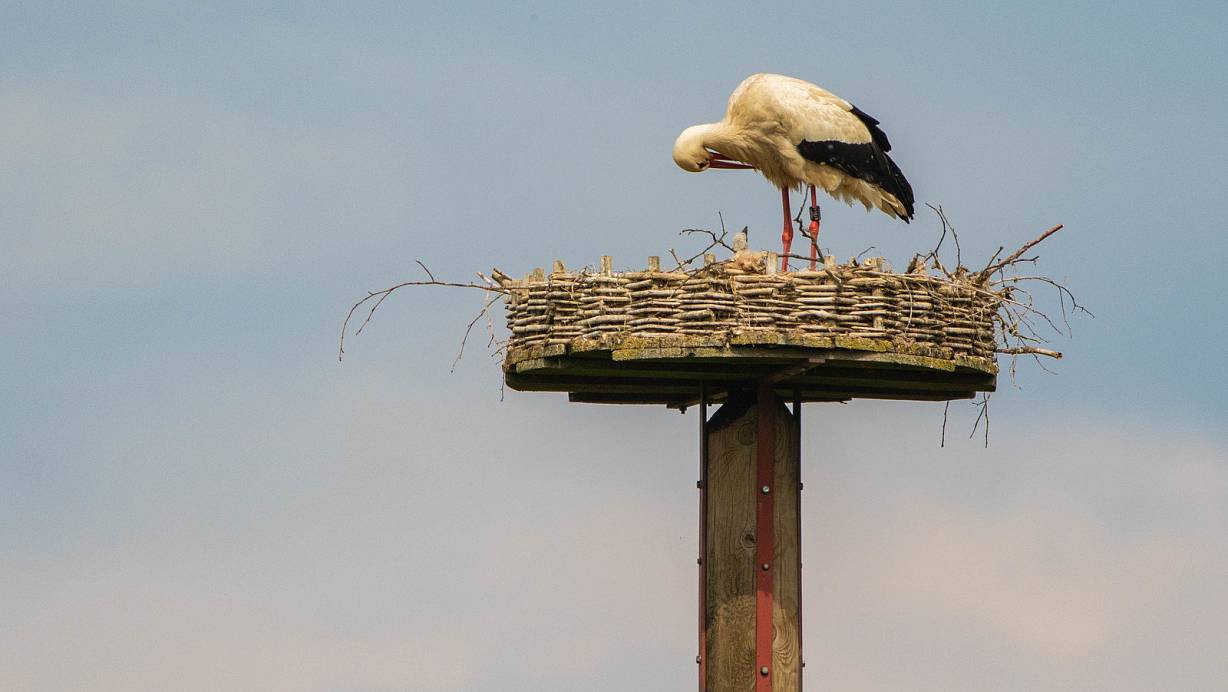 Auf dem Nest ist neben dem Altstorch das einzige Küken zu erkennen, das einige Tage später vom Rotmilan getötet wurde. Der Nistpfahl steht in den Grellewiesen in Bad Oeynhausen- Volmerdingsen. | © Brigitte Ellersiek
