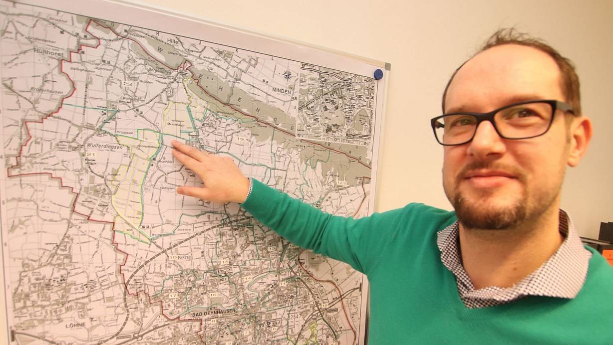 Sebastian Beyer vor der Karte mit der Einteilung Bad Oeynhausens in die 22 Wahlbezirke für die Kommunalwahl. | © Jörg Stuke