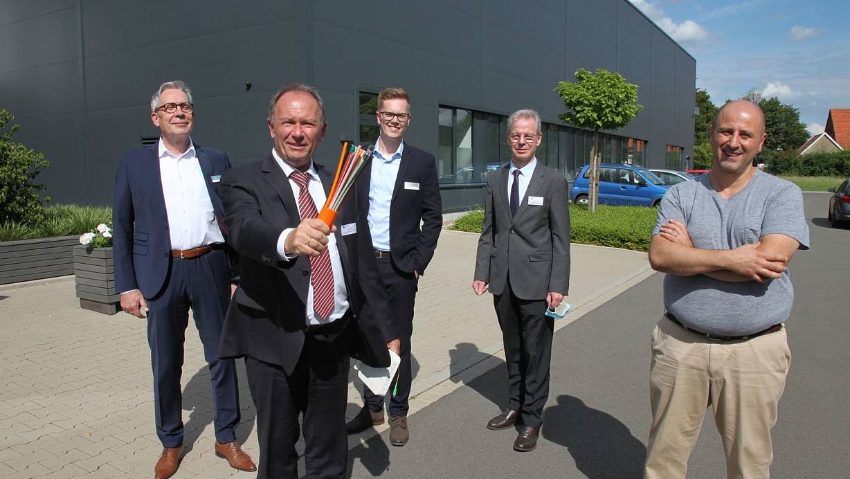 Referenten und Gastgeber der IHK-Sommerbereisung: Peter Koch (Deutsche Glasfaser/v. l.), Uwe Krabe (Greenfiber), Robin Wulf (Telekom), Eckhard Rüter (Unternehmer und IHK-Vollversammlungsmitglied) und Petros Jossifidis (PrimeLine). | © Nicole Bliesener