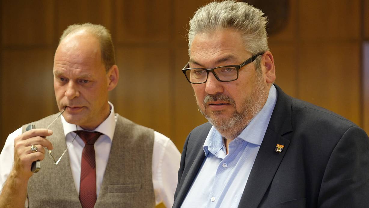 Freude sieht anders aus: Olaf Winkelmann (SPD, l.) und der amtierende Bürgermeister Achim Wilmsmeier schauen ein wenig fassungslos auf die Wahlergebnisse, die gerade auf der Leinwand im Ratssaal zu sehen sind. |