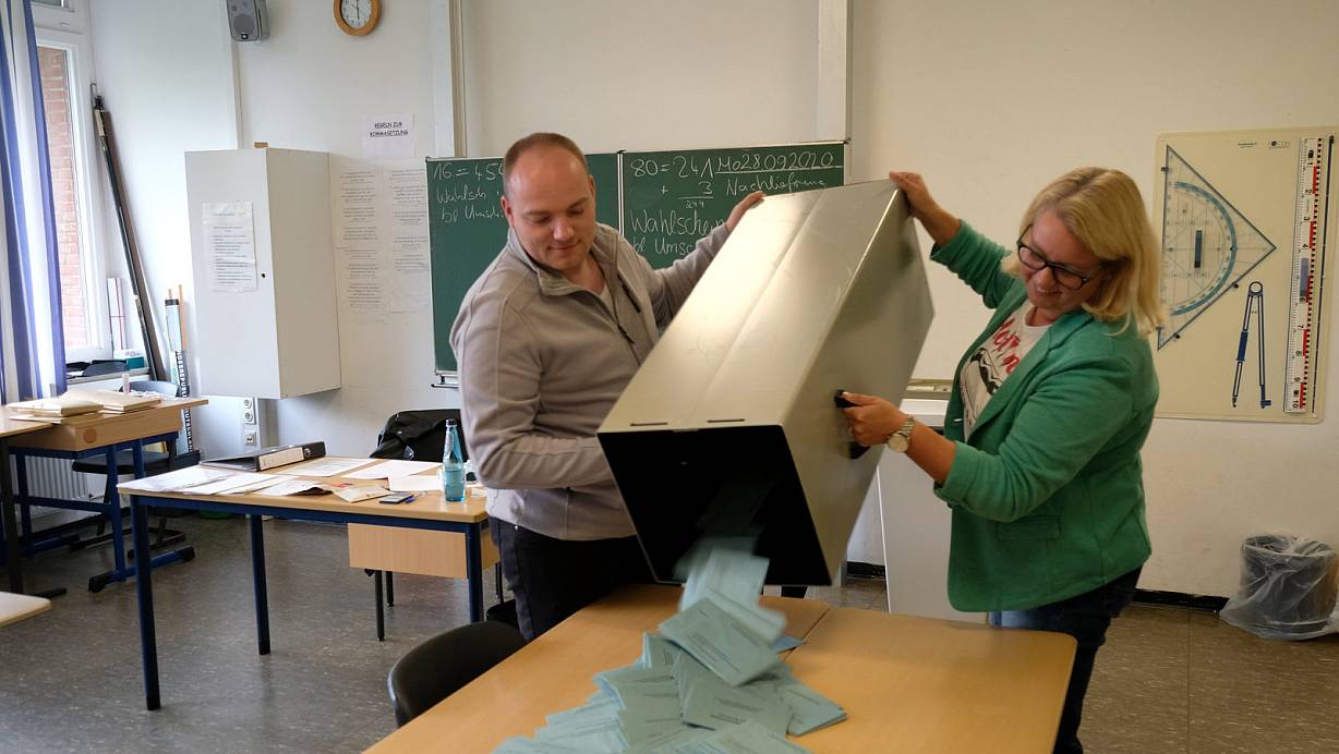 18.01 Uhr: In der Realschule Nord leeren Robert Bremer (l.) und Cornelia Thamm-Grunow eine der Briefwahlurnen. | © Thorsten Gödecker