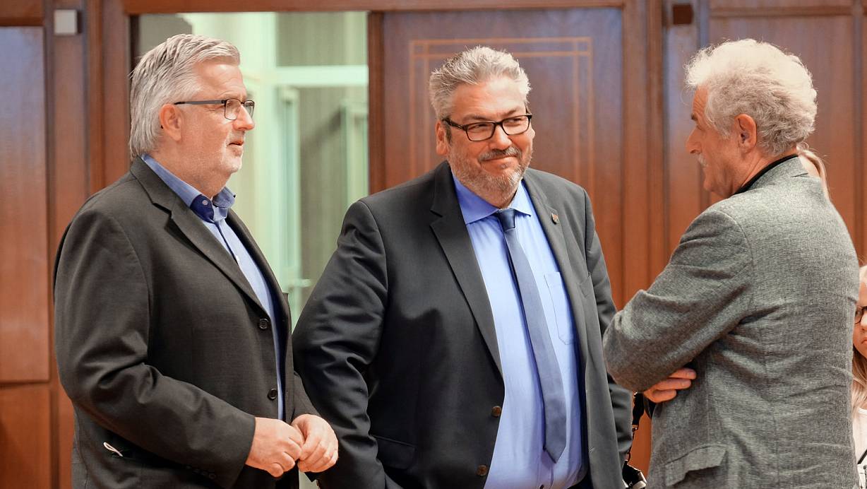 Der SPD-Stadtverbandsvorsitzende Ralf Jaworek (v. l.), Achim Wilmsmeier und der BBO-Fraktionsvorsitzende Reiner Barg sprechen am Sonntagabend. | © Thorsten Gödecker