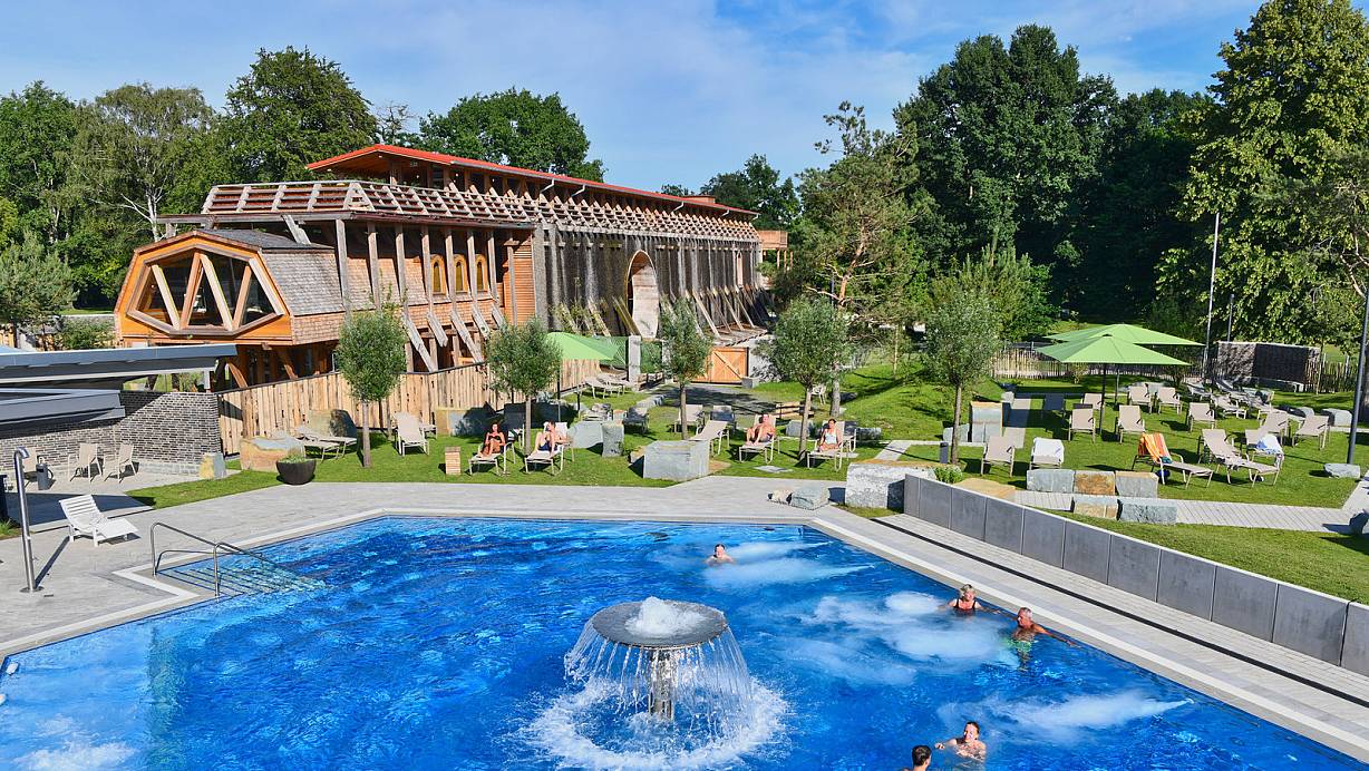 Ein Überblick über die Börde-Therme in Bad Sassendorf. Hinten das Gradierwerk, von dem ein Teil lediglich den Gästen der Therme vorbehalten ist. | © Volker Beushausen