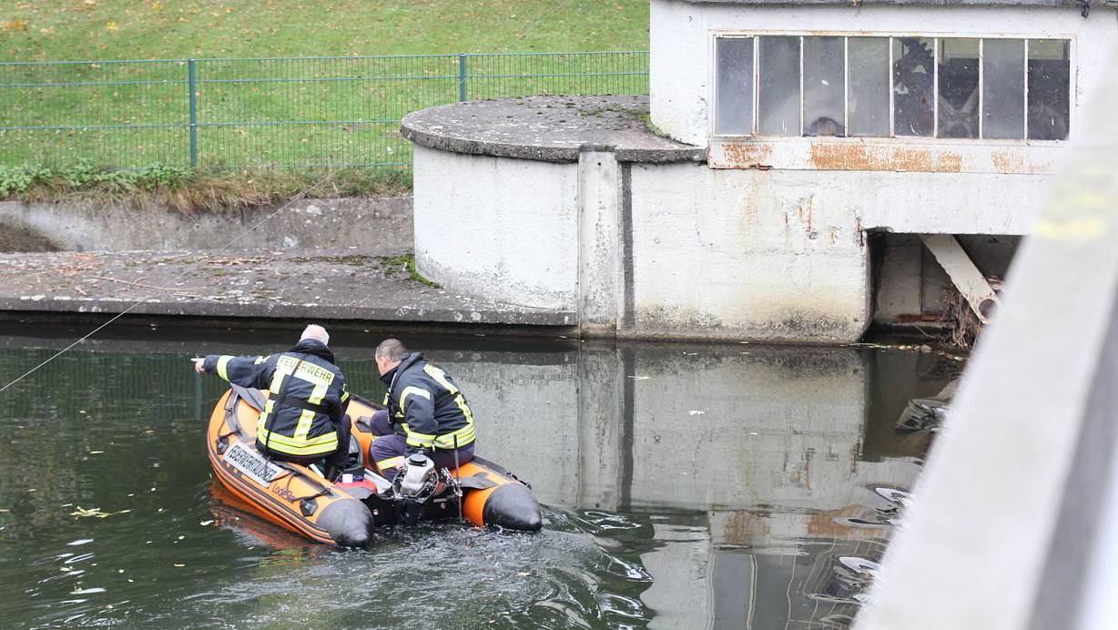 Feuerwehrtaucher durchsuchten am Freitag vom Schlauchboot aus mit einem Unterwasser-Sonar den Bereich vor dem Sielwehr. | © Ulf Hanke