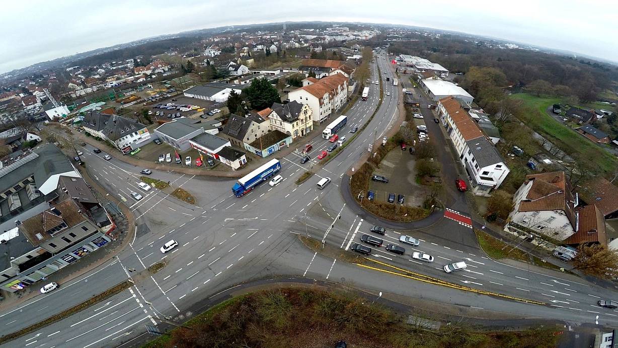 Bad Oeynhausens gordischer Verkehrsknoten: Die Kreuzung der Mindener Straße mit der Eidinghausener (rechts) und der Steinstraße (links) ist der neuralgische Punkt im Verkehrsnetz der Kurstadt. | © Jürgen Krüger