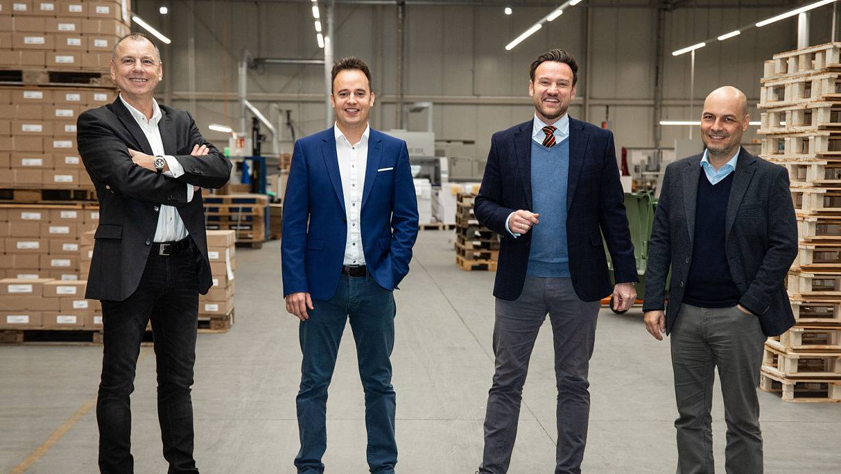 Hendrik Struckmeier, Geschäftsführer Sattler Premium Print (zweiter v.l.) mit den Leitern der Sattler Media Group, Matthias Rostalski (v.l.), Martin Koschei sowie Ralf Büttner. | © Firma Drake