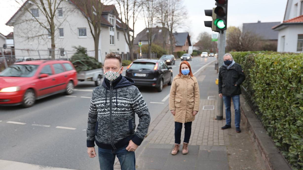 Thomas Steinmeier (v. l.), Mareike Poggemöller und Dietmar Mirgeler sind nur ein Bruchteil der neuen Anliegergemeinschaft Werster Straße. An der Ampel Besselstraße bemängeln sie, dass diese dem fließenden Verkehr Vorrang gewährt und Fußgänger lange Wartezeiten hätten. | © Nicole Sielermann