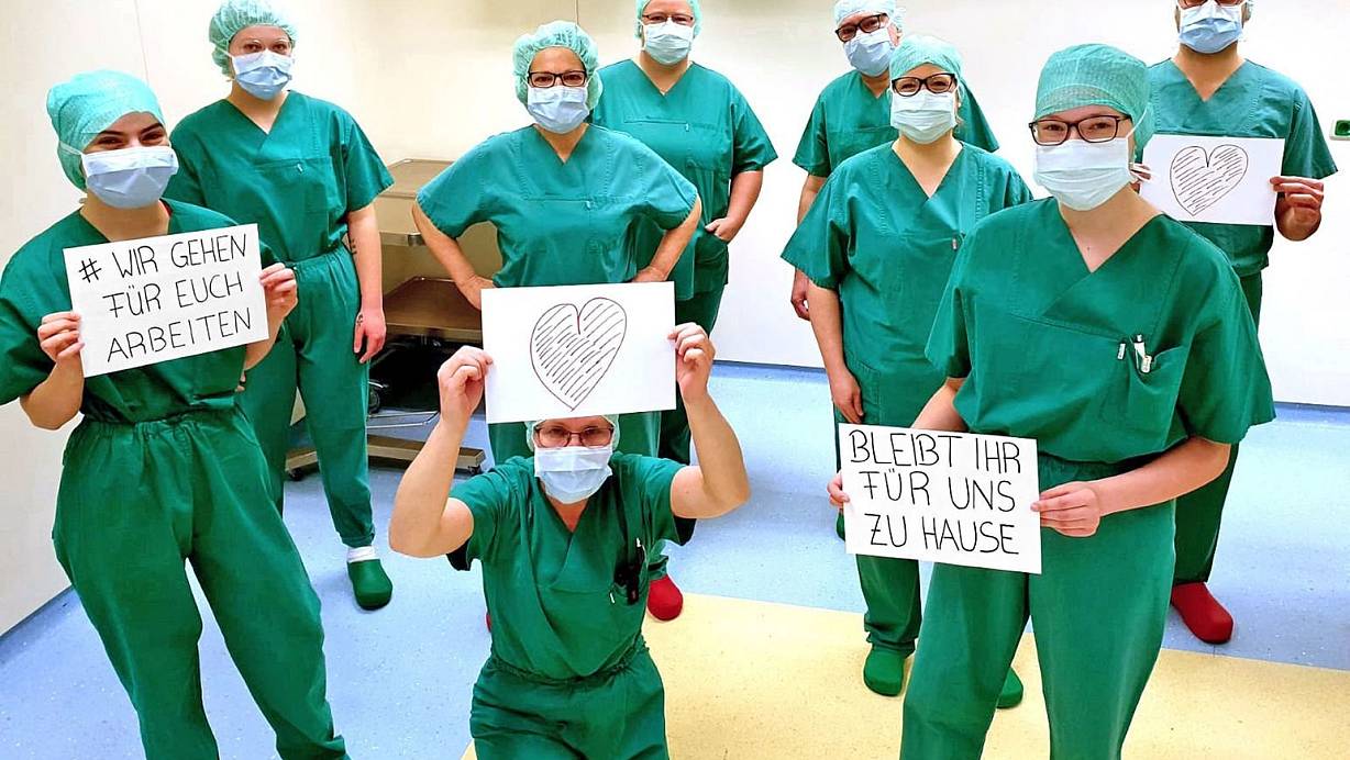 Bleibt zu Hause: Das Team der Mühlenkreiskliniken wendet sich mit einer Botschaft an die Bürger im Mühlenkreis: „Wir gehen für Euch zur Arbeit, bleibt ihr für uns Zuhause", fordern sie.  | © Mühlenkreiskliniken