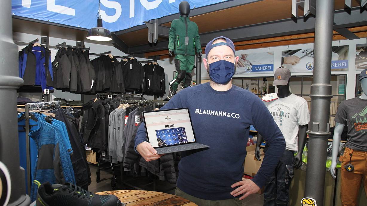 Markus Harm verkauft in seinem Geschäft "Blaumann und Co." Arbeitskleidung. Die Corona-Pandemie hat er als Chance begriffen. Der Online-Handel beschert ihm mittlerweile sechsstellige Umsätze.