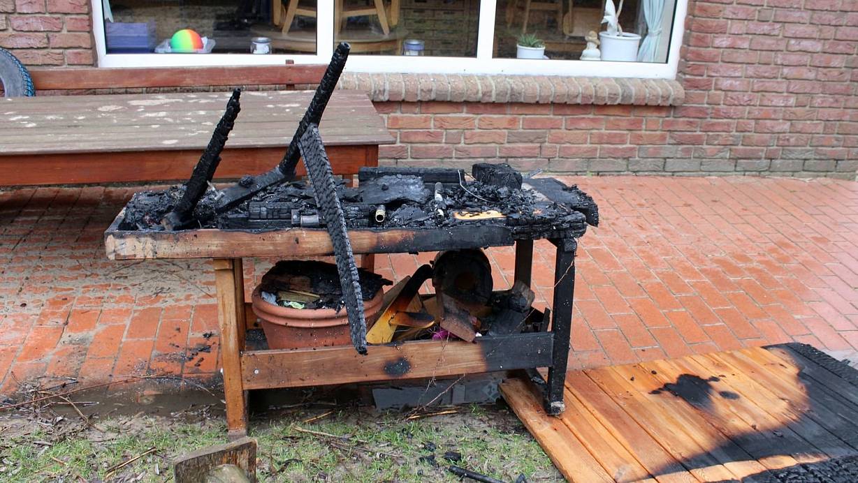Die stark verkohlte hölzerne Werkbank war Ausgangspunkt des Brandes. | © Polizei Minden-Lübbecke