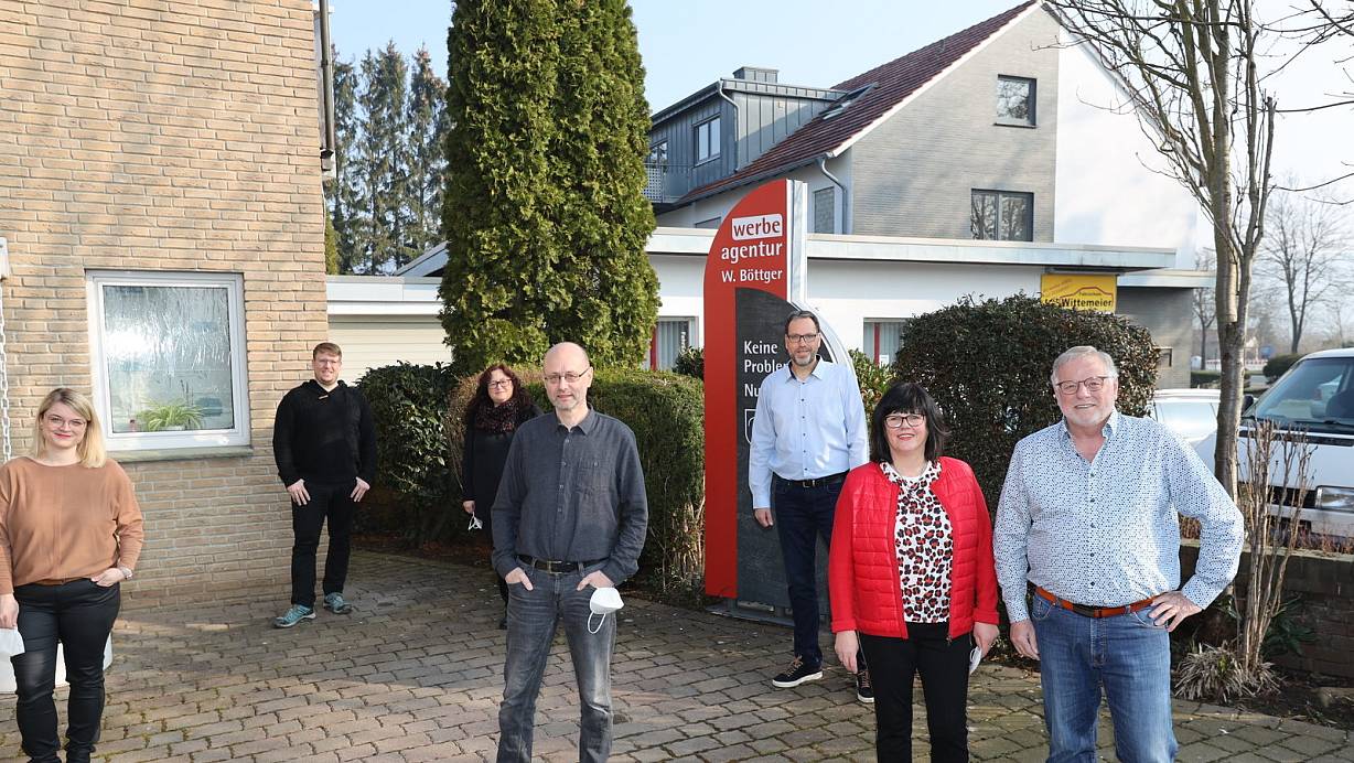 Eingespieltes Team: Wolfgang Böttger und seine Frau Gabriele (rechts im Bild) feiern mit ihren Mitarbeitern Carina Böttger (v. l.), Jan Schmale, Manuela Röthemeyer, Jochen Sunderbrink und Dirk Weber runden Geburtstag ihrer Werbeagentur. | © Nicole Sielermann