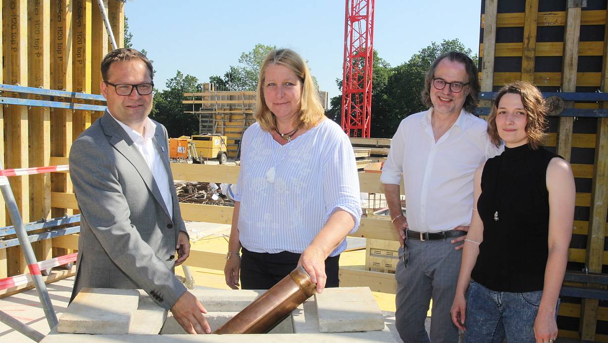 Botschaft im Kupferrohr: Bürgermeister Lars Bökenkröger (CDU, v.l.) versenkt mit Schulleiterin Anke Lehmann, Architekt Karsten Schlattmeier, Dirk Lorenz, Loren Strunk und Projektleiter Rainer Freymuth von der Stadtverwaltung eine Zeitkapsel für die Grundschule Eidinghausen. | © Ulf Hanke
