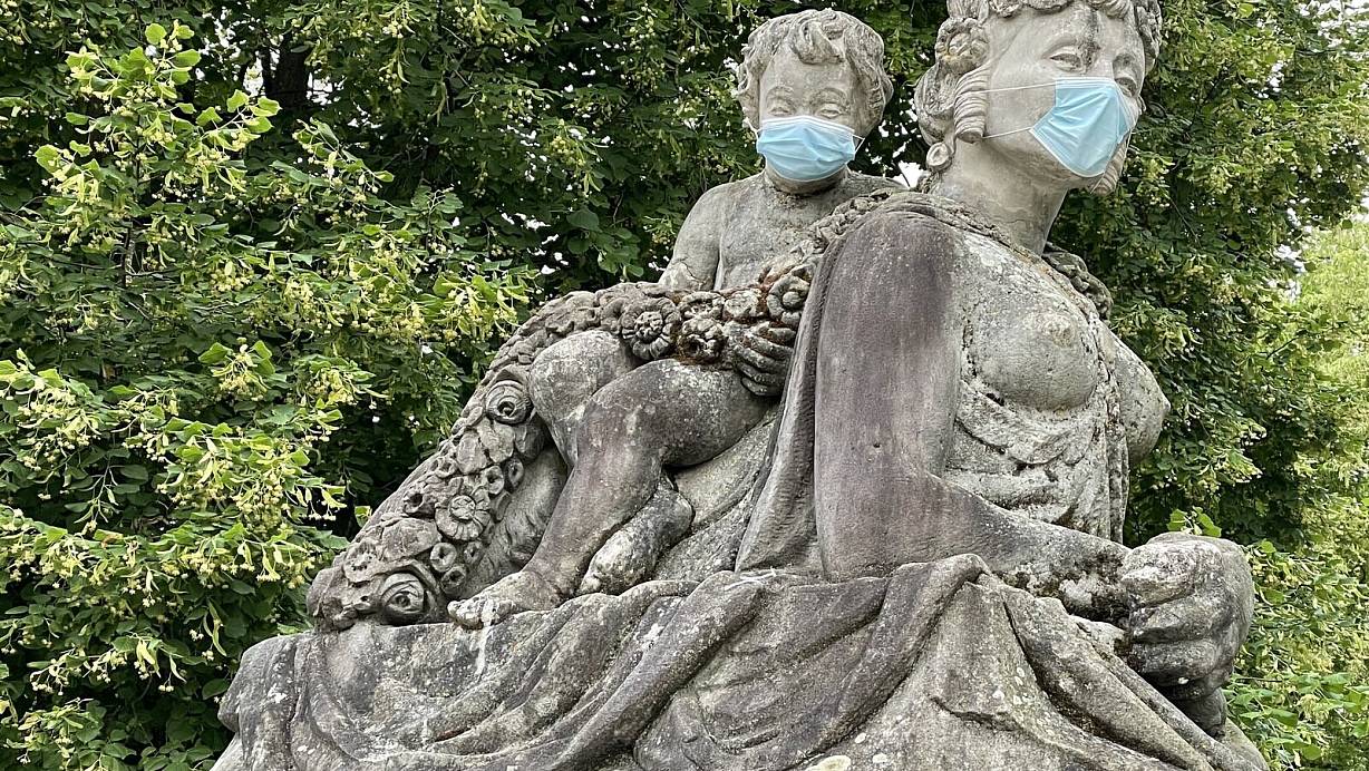 Auch wenn die beiden Sphinxe auf dem Kurhausvorplatz Tag und Nacht damit beschäftigt sind, das Areal zu bewachen, achten sie dabei trotzdem auf die Corona-Vorschriften. | © Elke Niedringhaus-Haasper