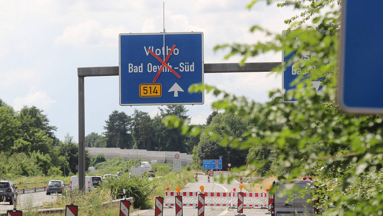 Die Abfahrt Vlotho ist weiter gesperrt: Fahrtrichtung Dortmund auf der Weserflutbrücke der A2 im Kreuz Bad Oeynhausen. | © Ulf Hanke