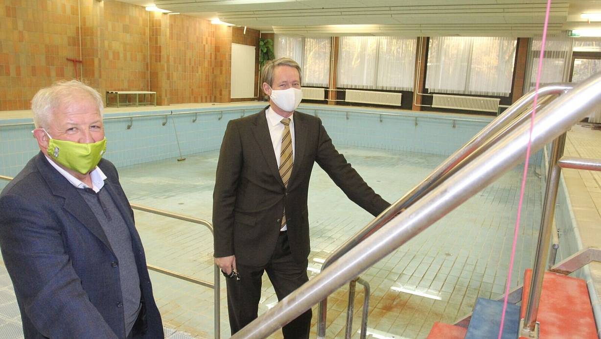 Holger Diekmann (l.) und Thies Boysen, Eigentümer der ehemaligen Weserklinik, stehen im Schwimmbecken, in dem Wassergymnastik des BSG stattfinden soll. | © Ulf Hanke