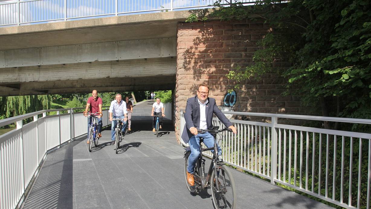 Bevor die Absperrungen beiseite geräumt werden, rollen die ersten Radler durchs ehemalige Nadelöhr. Auf der wichtigen West-Ost-Verbindung am Fluss ist jetzt richtig viel Platz.