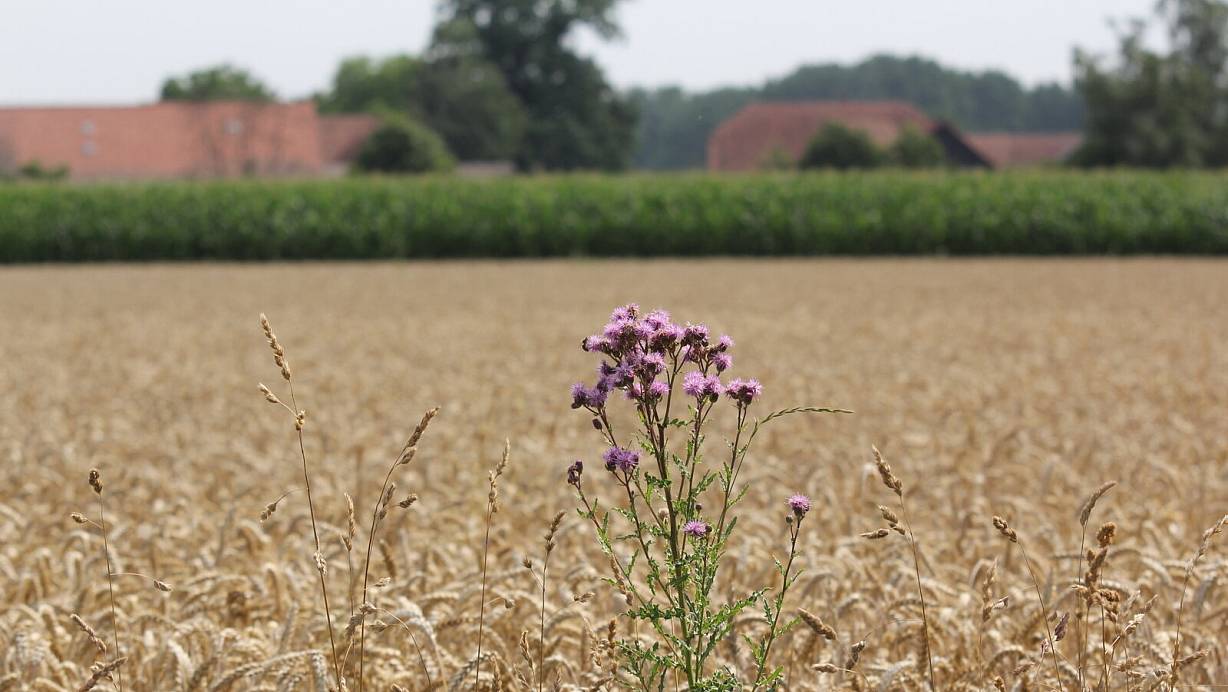 Eine Ackerdistel blüht im Getreidefeld. Das sehen die Landwirte gar nicht gern, weil die Pflanze das Getreide verdrängt. | © Ulf Hanke