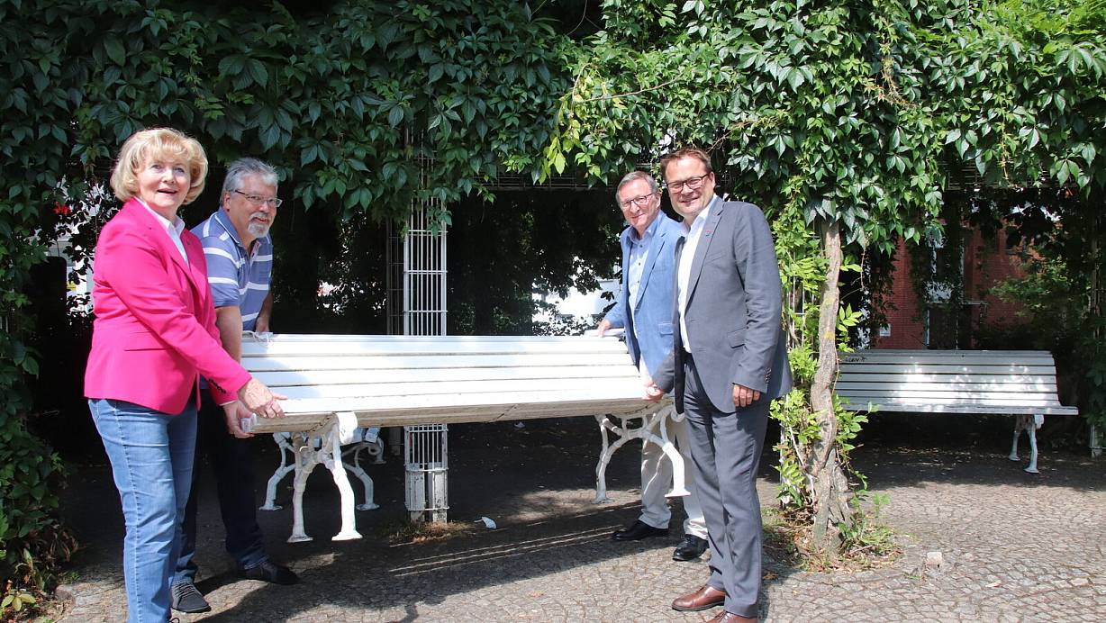 Helke Nolte-Ernsting (v.l.), Uwe Sindermann, Kurt Nagel und Lars Bökenkröger probieren schon mal aus, wie leicht die Bank am Augustaplatz entfernt werden kann. | © Heidi Froreich