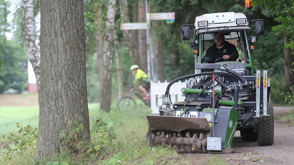 Eine Firma fräst in Bad Oeynhausen den Schotter vom Geh- und Radweg südlich der Werre und zieht alles wieder glatt. Allerdings nur bis zur Stadtgrenze.