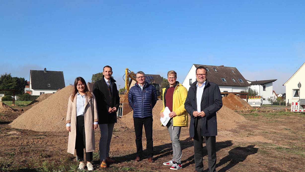 Valeria Usatschov, (v.l.), Patrick Zahn. Thomas Luer, Jens Grove (Teamleiter Bauangelegenheiten) und Lars Bökenkröger präsentieren das neue Baugebiet. | © Heidi Froreich