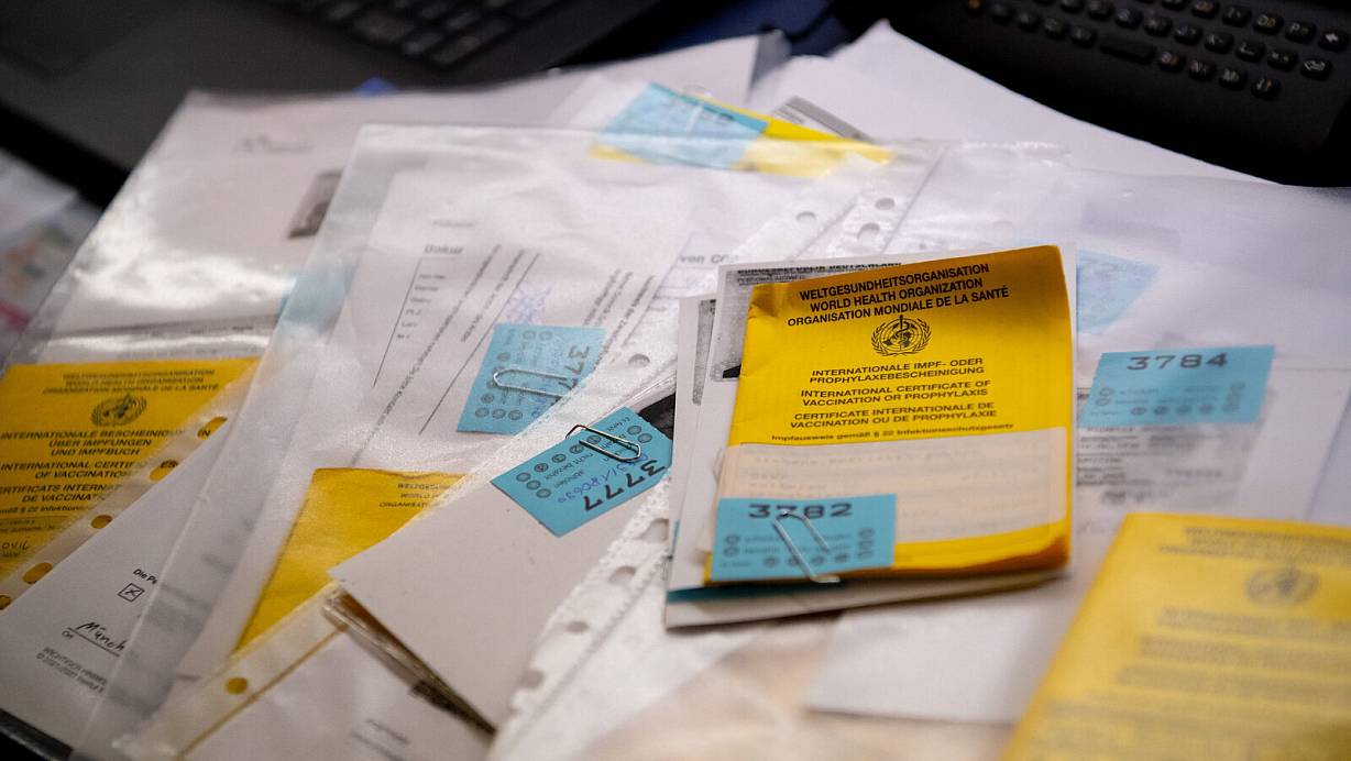 Zahlreiche Impfpässe liegen in einer Apotheke in einem Büro auf einem Tisch. Die gibt es offenbar auch auf Parkplätzen im Kreisgebiet günstig zu kaufen. | © Sven Hoppe