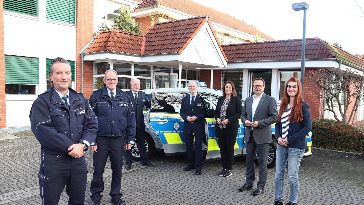 Die beiden Bezirksbeamten Achim Römer (v.l.) und Thmas Droste nehmen beim Start in ihre neuen Aufgaben die besten Wünsche von Andreas Jürgensmeyer (Leiter Polizeiwache Bad Oeynhausen), Polizeidirektor Mathias Schmidt, Landrätin Anna-Katharina Bölling, Bürgermeister Lars Bökenkröger und Ordnungsamtsleiterin Manuela Brune entgegen. | © Heidi Froreich