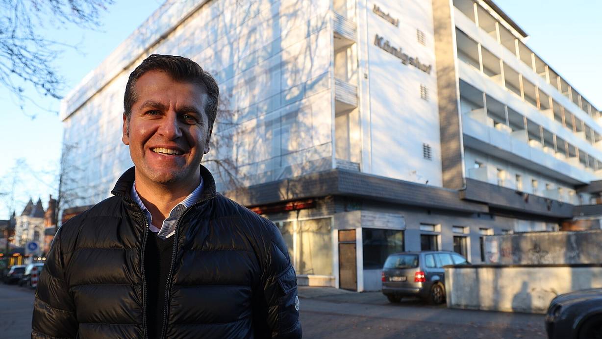 Manuel Ersay vor dem Königshof, dessen Fassade mit einer Plane gesichert ist. Das darauf gedruckte Bild zeigt die Hotelfassade, wie sie einmal werden soll. | © Jörg Stuke