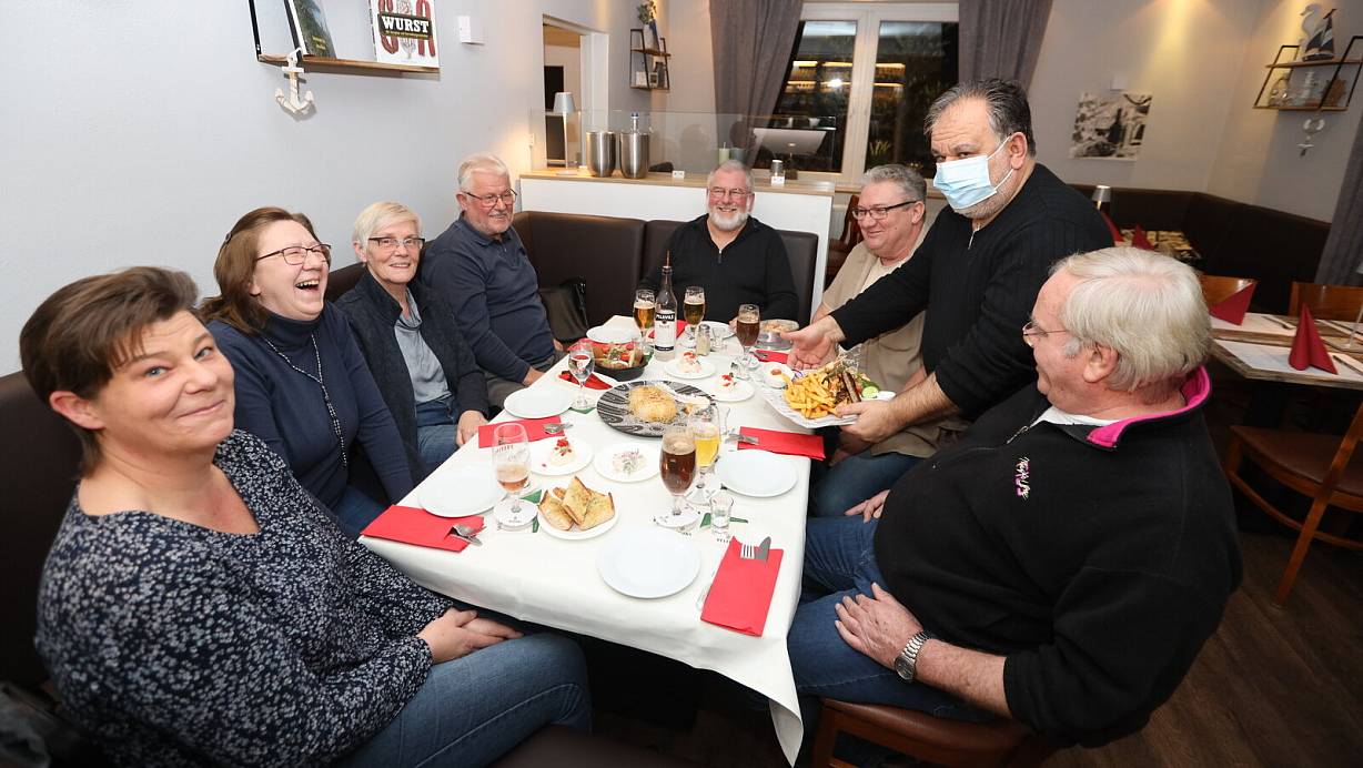 Wirt Evangelos Botsios serviert die Vorspeisen-Auswahl. Für Daniela Windmeyer (v. l.), Christina Höke, Erika und Rolf Baake, Jürgen Höke, Hans-Jürgen Windmeyer und Dieter Riesmeier gehört das zum Sonntagabend dazu. | © Nicole Sielermann