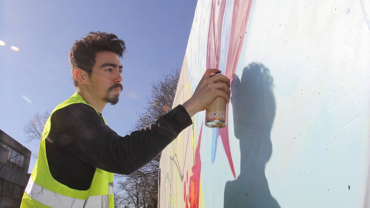 Der Künstler und Breakdancer Reza Jaxon verwirklicht ein neues Wandgemälde. Die Polizei war auch schon da.
