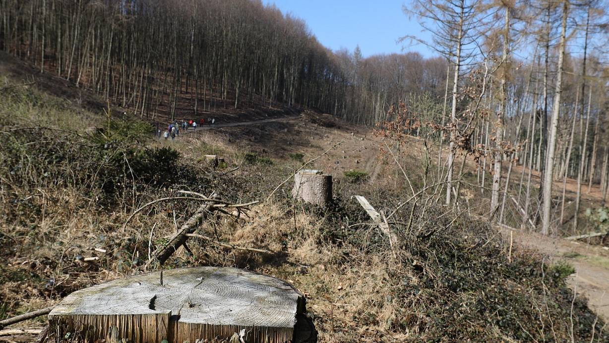 Auch im Wiehengebirge nördlich von Bad Oeynhausen gibt es stattliche Kahlflächen, auf denen früher Fichten standen. Im Hintergrund die Lesergruppe mit Förster Markus Uhr auf dem Weg. | © Jörg Stuke