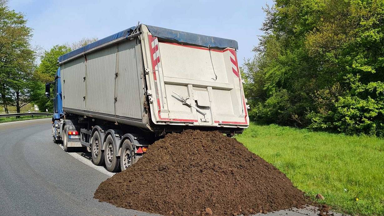 Bei der Auffahrt auf die A2 öffnete sich beim Sattelkipper die hintere Klappe und entlud rund 10 Tonnen Schweinemist. Reinigungsarbeiten sorgten für Stau.