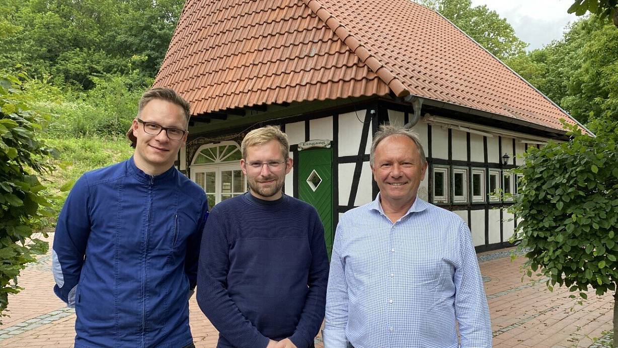 Freuen sich auf erste Gäste: Moritz Weber (v. l.). Friedrich Büntemeyer und Uwe Krabbe im Biergarten der "Wittekindsquelle". | © Nicole Sielermann
