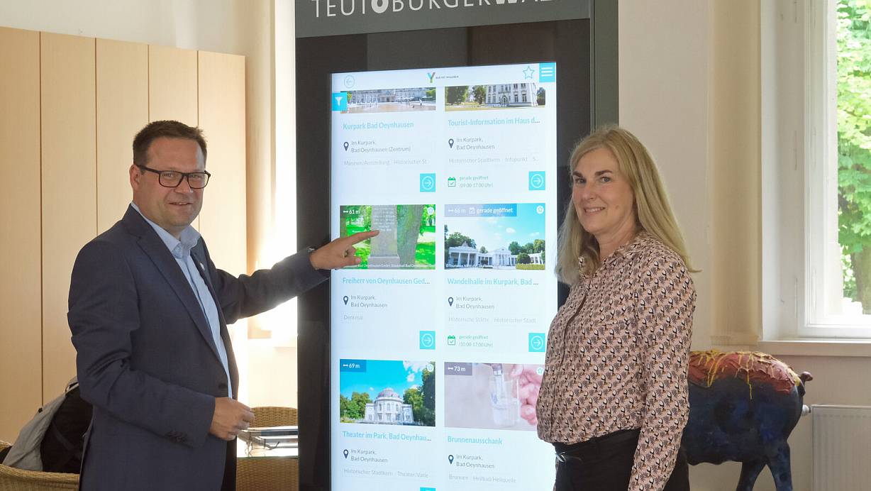 Touchsreen: Bürgermeister Lars Bökenkröger und Staatsbad-Geschäftsführerin Beate Krämer demonstrieren, wie einfach die interaktive Navigation durch die touristischen Angebote der Region jetzt schon ist. | © Thorsten Gödecker