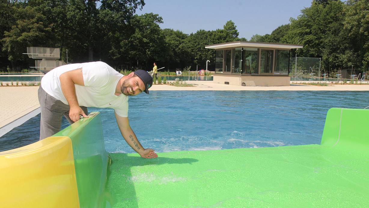 Das Wasser im neuen Freibad im Siel wird nur mit Sonnenenergie beheizt. Schwimmmeister Marc Brünger fühlt auf der neuen Regenbogenrutsche schon mal vor. | © Ulf Hanke