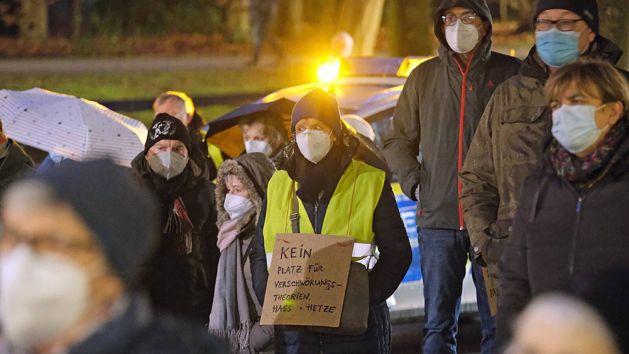 Die unter Impfkritikern und Coronaleugnern kursierenden Verschwörungserzählungen thematisiert dieses Plakat, das auf einr Gegendemonstration gezeigt wurde. | © Thorsten Gödecker