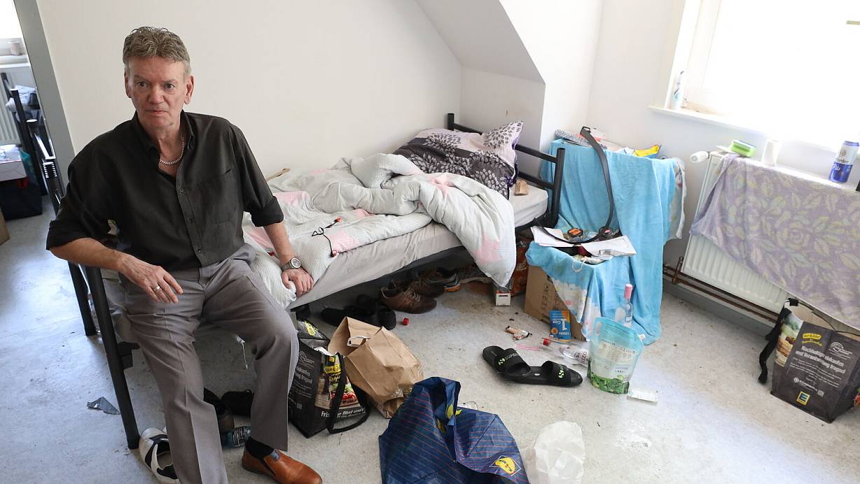 Rolf E. ist entgeistert vom Zustand des Zimmers, das die Stadt ihm in der Obdachlosenunterkunft an der Königstraße zugewiesen hat. Nichts von dem, was in dem Zimmer herumliegt, gehört ihm. | © Jörg Stuke