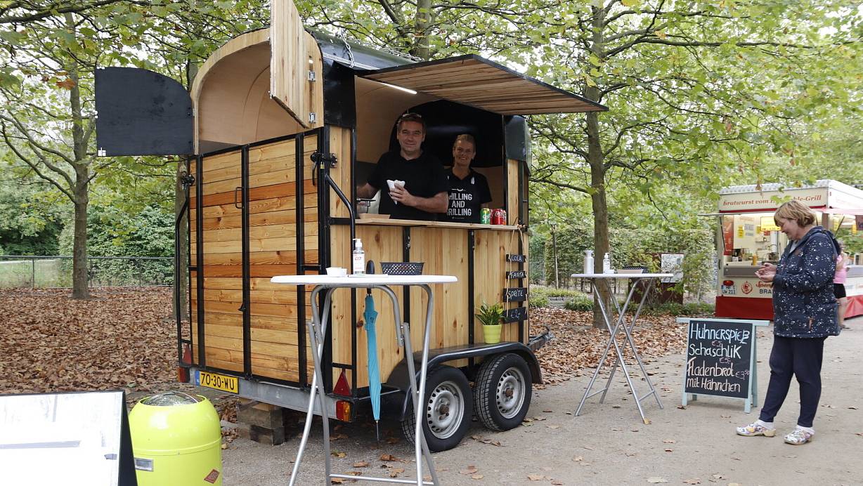 In einem ehemaligen Pferdeanhänger verkaufen Geert und Yvonne van der Tuuk Hühnersuppe. | © Heidi Froreich