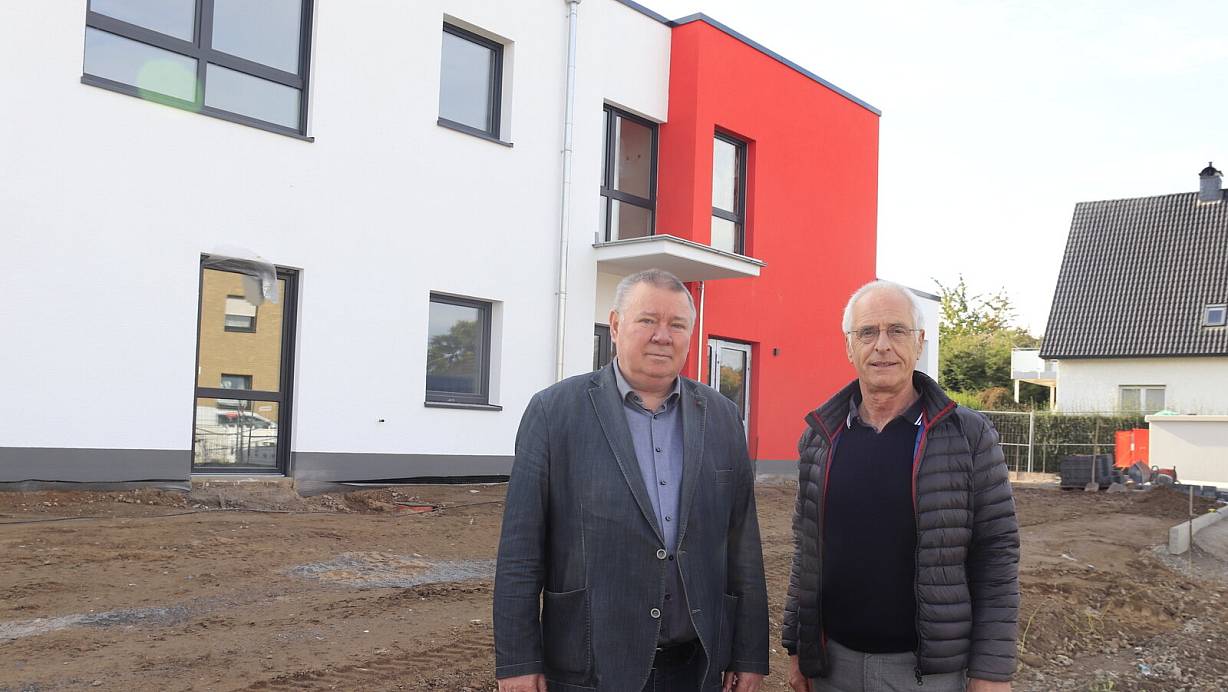 In den DRK-Farben rot und weiß präsentiert sich die neue Kita. Bauleiter Heinrich Harder (l.) und DRK-Geschäftsführer Hans-Jürgen Weber sind mit dem Baufortschritt zufrieden. | © Heidi Froreich