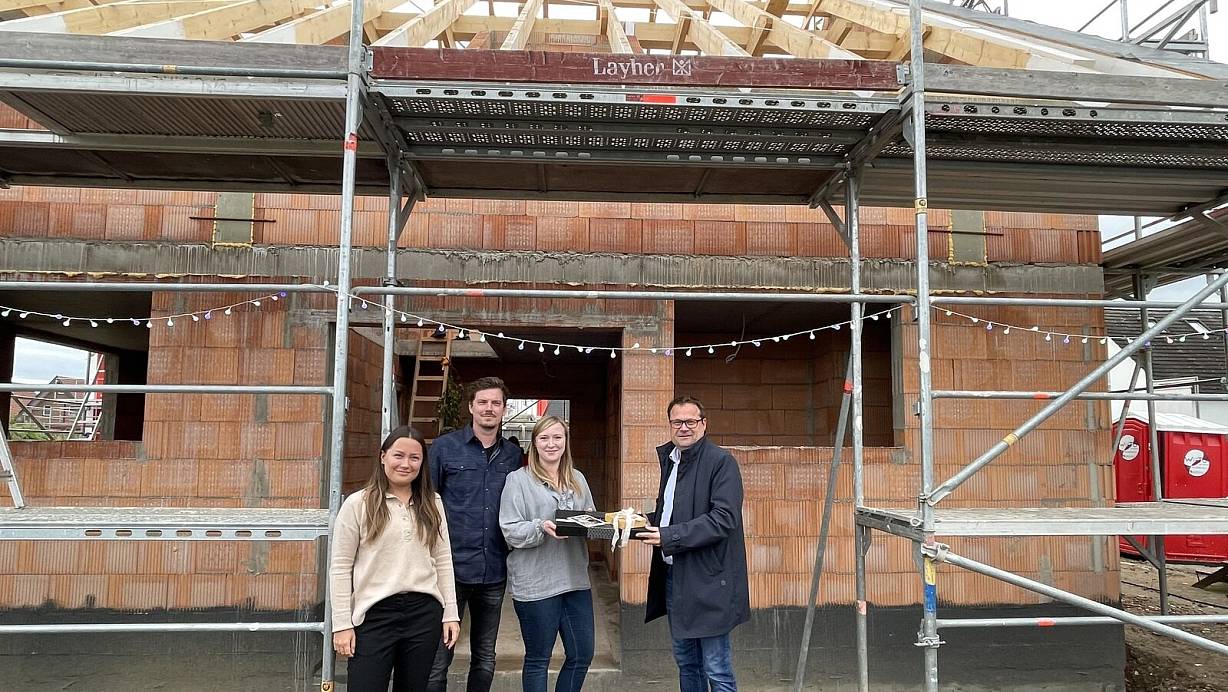 Bürgermeister Lars Bökenkröger (r.) und Valeria Usatschov von der Wirtschaftsförderung (l.) übergeben ein Geschenk zur Einweihung des Rohbaus an die Hausherren Karine Pfeifer und Benedikt Mertens. | © Elke Niedringhaus-Haasper