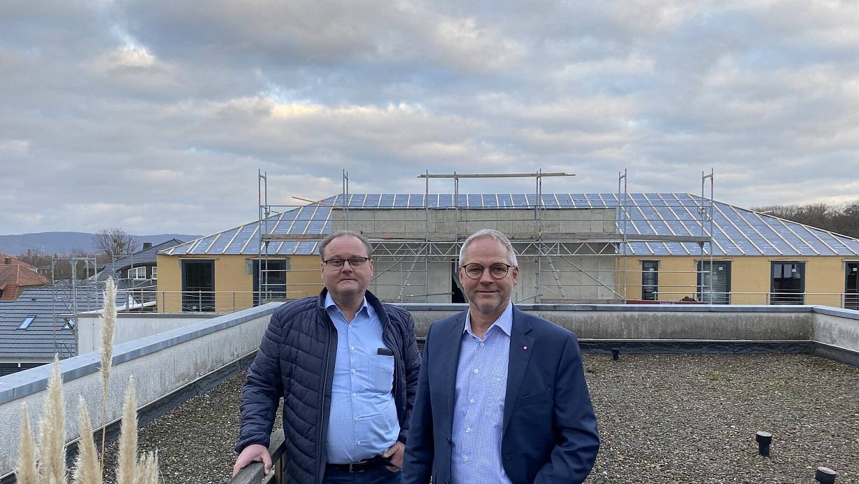 Bernward Ellrott (l.) und Michael Schelp stehen auf dem Flachdach, das als zweites aufgestockt wird. Im Hintergrund ist bereits das erste neue Staffelgeschoss zu sehen. | © Nicole Sielermann