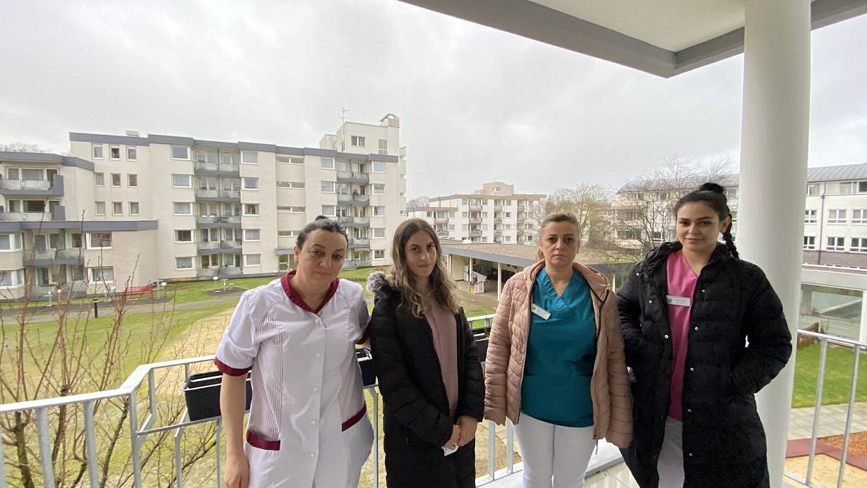 Dolmetscherin Sultone Rexhepaj (v. l.), Enisa Mahmuti, Vjolica Kurti und Klaudia Haxhiu auf dem Balkon des Neubaus am Seniorenzentrum Bethel, dessen andere Gebäudeteile im Hintergrund zu sehen sind. | © Nicole Sielermann