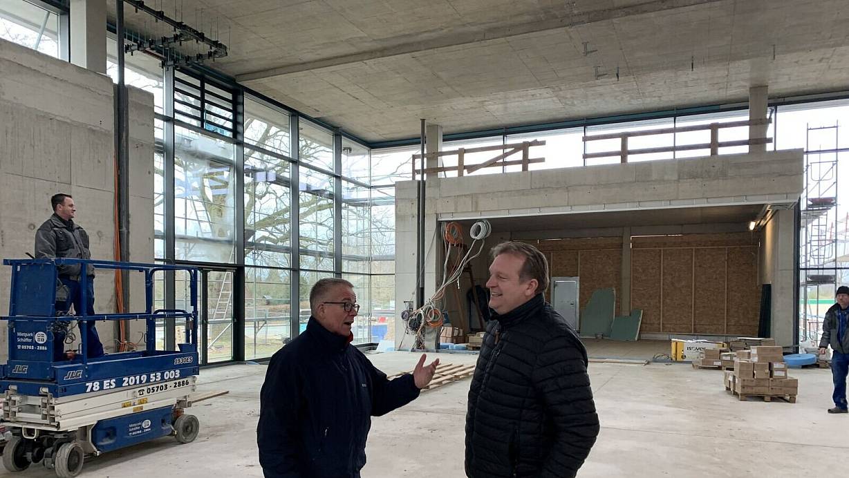 Viel Platz in der offenen Mitte: Stadtsprecher Volker Müller-Ulrich und Dieter Hinzmann vom städtischen Gebäudemanagement sprechen über den Baufortschritt im Neubau der Grundschule Eidinghausen. | © Nicole Bliesener