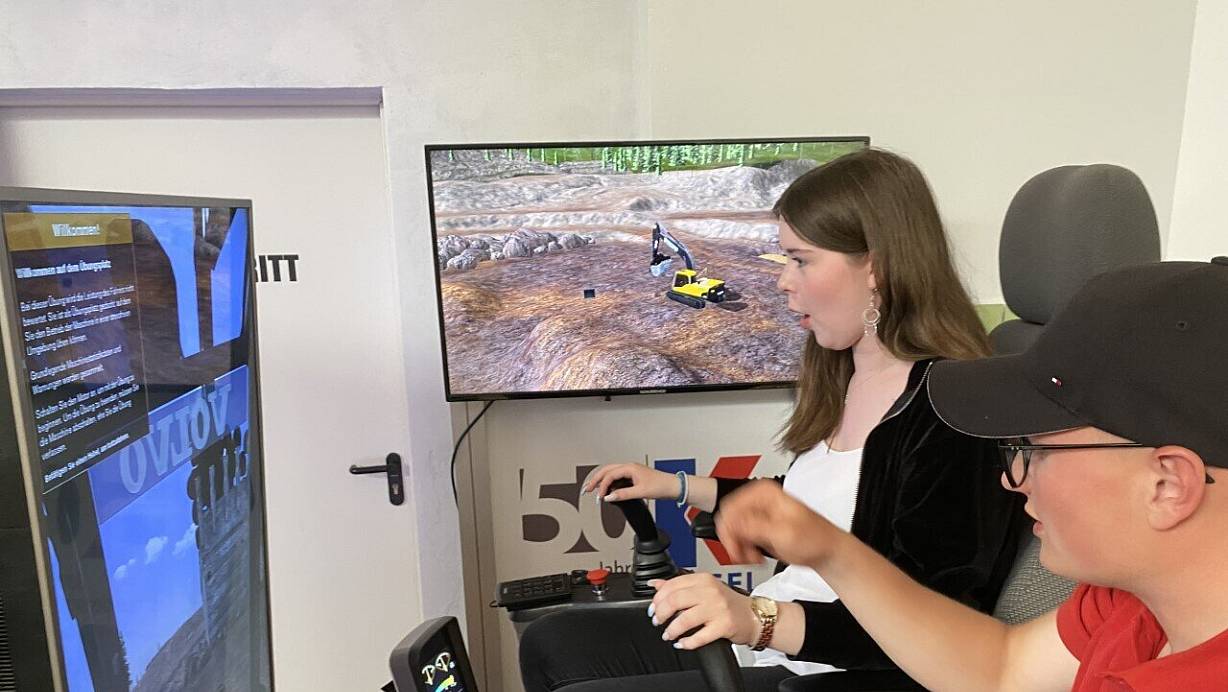 Emma Nävy testet auf unserem Archivbild in der Zukunftswerkstatt den Baggersimulator der Firma Kögel, den Kim Lucas Meier ihr erklärt. | © Nicole Sielermann