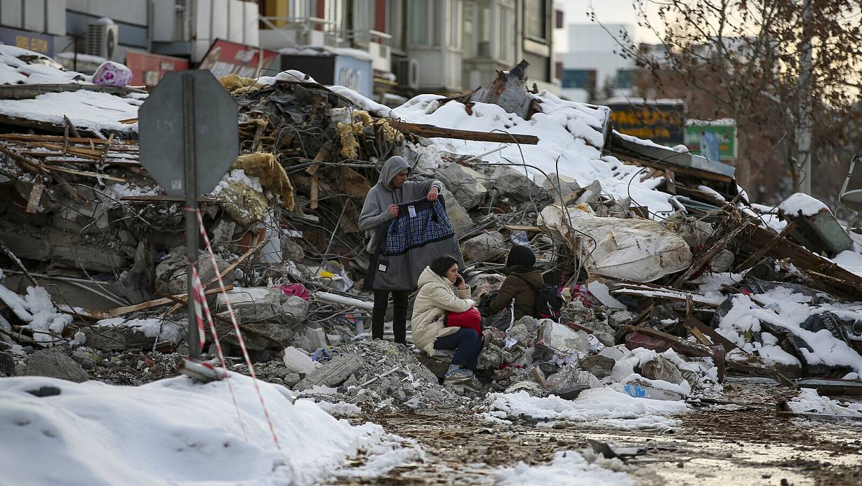 Menschen sitzen zwischen den Trümmern vor einem eingestürzten Gebäude in Malatya. Der türkische Wetterdienst hat für die vom Erdbeben betroffenen Gebiete niedrige Temperaturen und teils Schneefall und Regen vorhergesagt. | © EMRAH GUREL