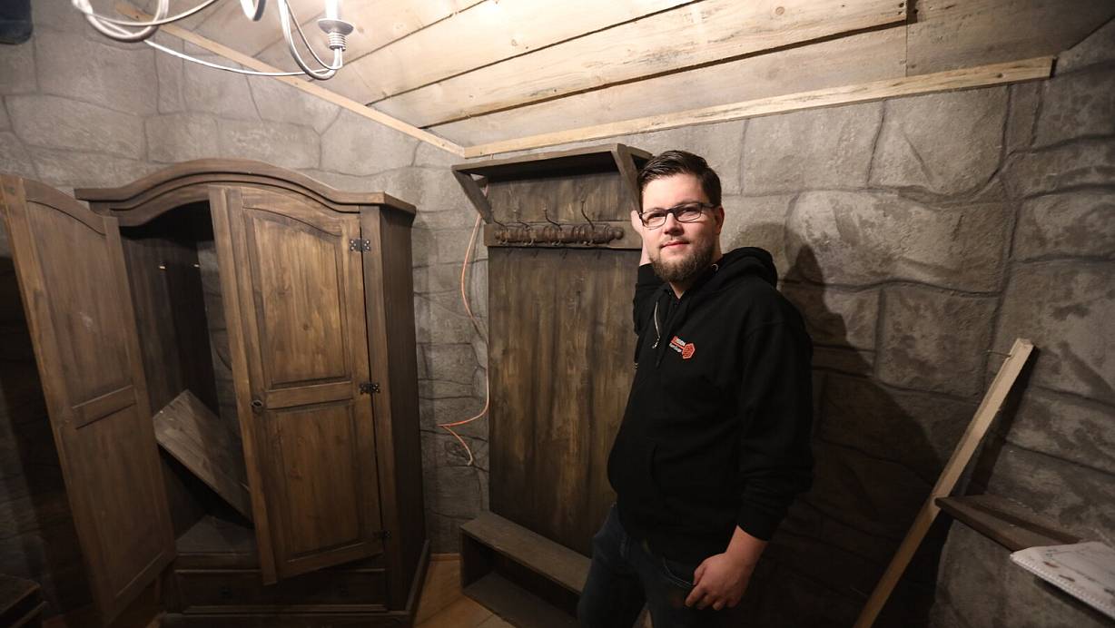 Sebastian Haupt gibt einen ersten Einblick in den neuen Escape-Room an der Königstraße. Noch ist dort Baustelle, aber ab Sommer sollen sich Besucher herausrätseln können. An den Wänden wurde echter Beton modelliert und weder Plastik noch Styropor genutzt. | © Nicole Sielermann
