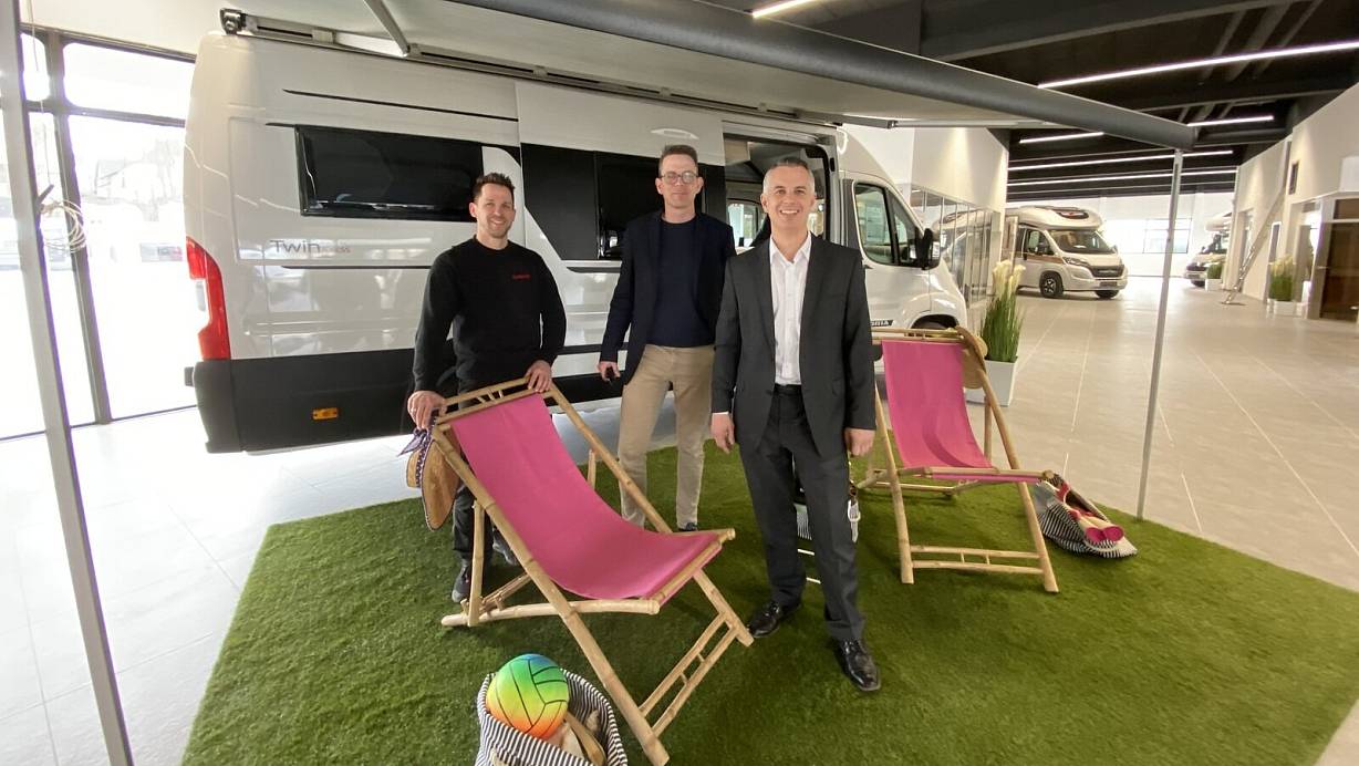 Farbenfroh startet das Peitzmeyer-Team mit Marcel Peitzmeyer (vorne) sowie Björn Nerge (hinten l.) und Nico Wördemann am kommenden Wochenende im neuen Caravan-Center an der Kanalstraße. | © Nicole Sielermann